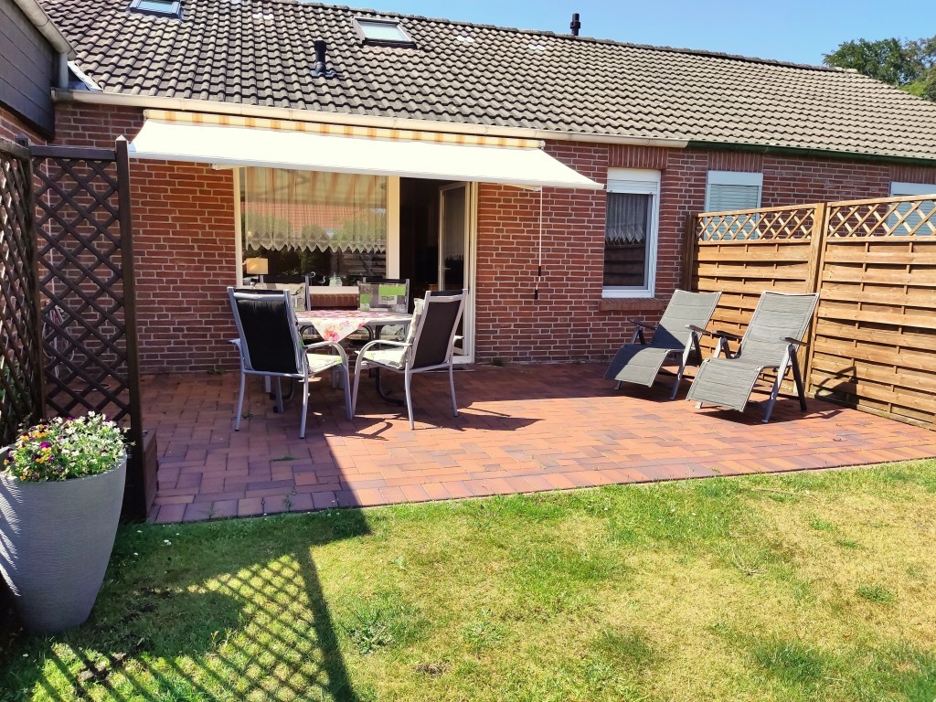 Zur Wohnung gehört eine große Terrasse mit Garten. Dieser wird von den Wohneinheiten Haus "Juist" und Haus "Baltrum" genutzt. Er ist durch Sichtschutzzäune und eine Hecke eingefasst.